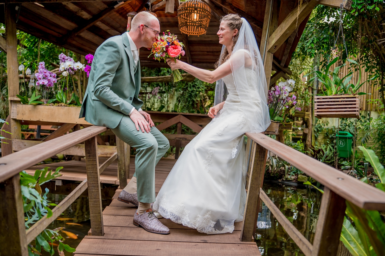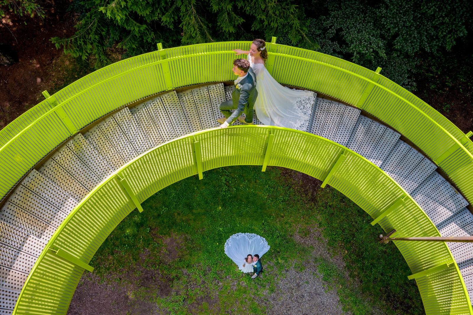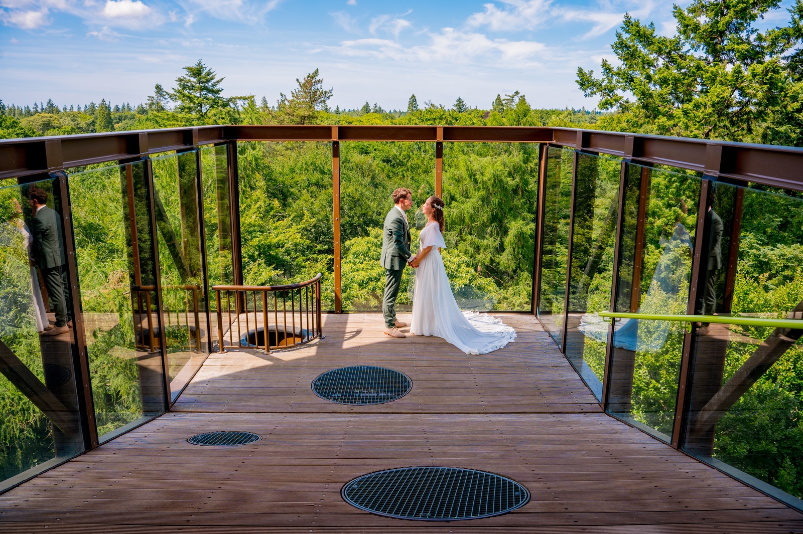 Bruid en bruidegom lopen naar boven op de Bostoren Schovenhorst in Putten