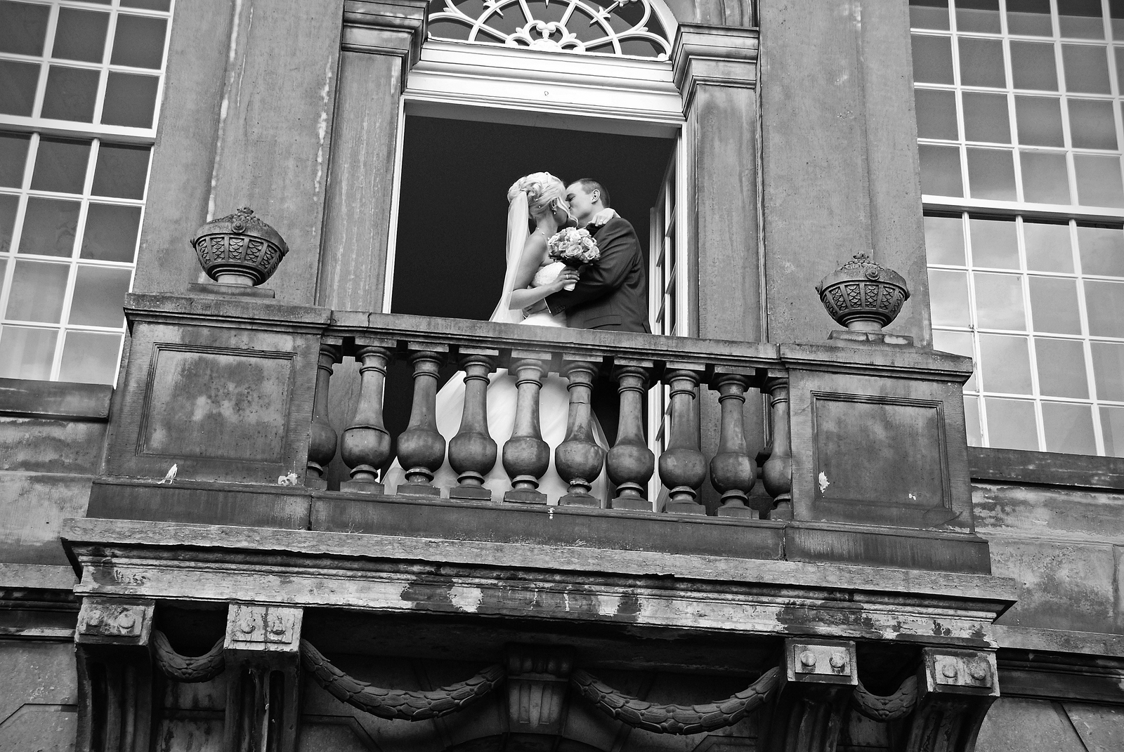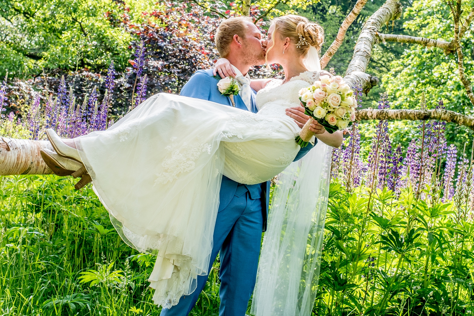 Bruidspaar kust elkaar bij het mooie Kasteel Doorwerth in Doorwerth