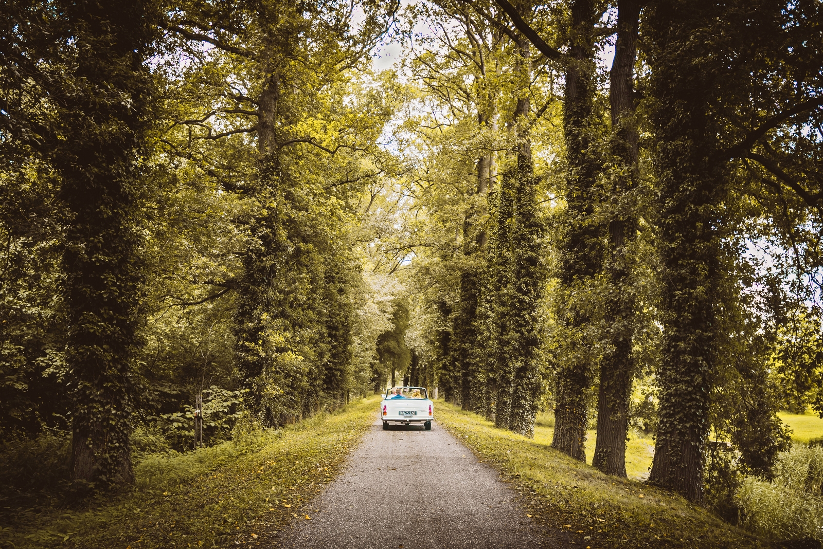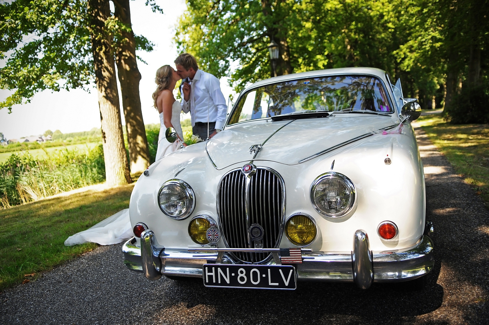 Bruidspaar naast een oude witte Jaguar MK2 2.4 trouwauto uit 1961