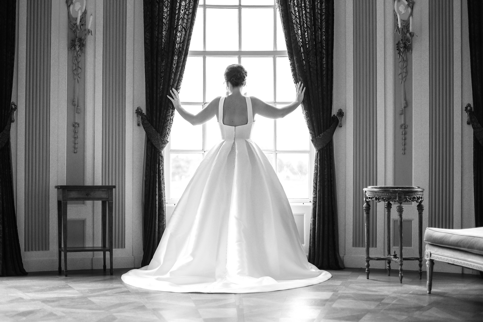 Bruid in witte jurk staat in het tegenlicht voor een groot raam in De Olde Looierij in Hoogeveen